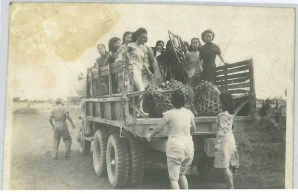 大卡車上有竹簍子.應該是大夥上街買東西!