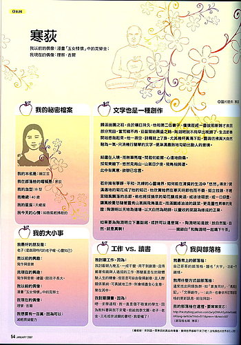貴雜誌社的主題是什麼?如果我可勝任的話,當然願意嘗試了。那就有勞您提供進一步的訊息了。 祝健康快樂 芷芸(寒荻)敬上