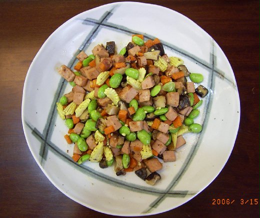 3.熱鍋加油,油熱後,先將香菇、素火腿煎出香味,再加入玉米筍,繼續翻炒三分鐘,最後加入煮熟之毛豆、紅蘿蔔、清水、鹽,再翻炒一分鐘後,蓋上鍋蓋燜;收汁後即可取出。