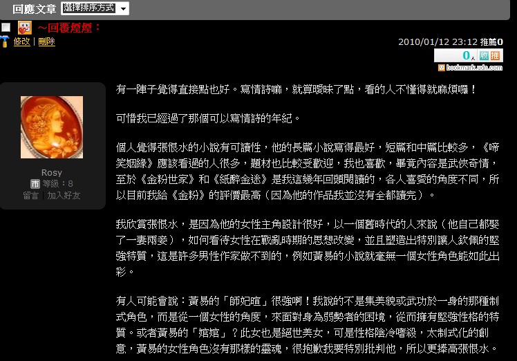 我相信自己不是您所指稱的那些「大多評論家」,我是金庸迷,也喜歡張恨水,我更愛讀古龍的武俠小說,我連梁羽生的作品都翻遍了,誰說「通俗文學」不是「文學」?那種囿於成見的人,就應該唾棄!