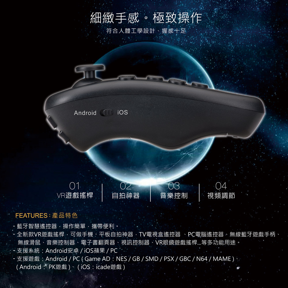 .全新款VR遊戲搖桿,可做手機、平板自拍神器,TV電視盒遙控器 、PC電腦遙控器、 無線藍牙遊戲手柄、無線滑鼠、音樂控制器、電子書翻頁器、視訊控制器、VR眼鏡遊戲搖桿...等多功能用途。