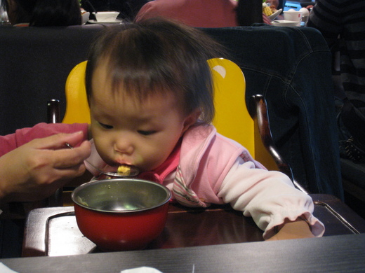 妞寶最近吃固體食物已大大進步,當天吃青菜 南瓜 地瓜 蛋黃等都吃的很好,真令人開心,出門吃飯選擇也多了些.
