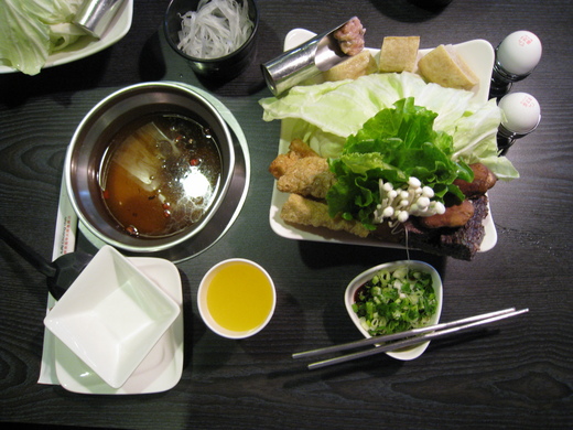 爸爸當天點了麻油雞鍋,媽媽點了日式昆布羊肉鍋,兩種鍋除了主菜不同外,連菜盤也不同,還蠻特別的.麻油雞的肉盤給的是雞腿肉,肉質Q彈好吃,再加上讓爸爸稱讚的米血及湯頭,評價大大提升.羊肉則還好,但火鍋菜盤配料多樣,媽媽還蠻喜歡的,尤其是排骨酥更是讚, 令人回味無窮.值得推薦.