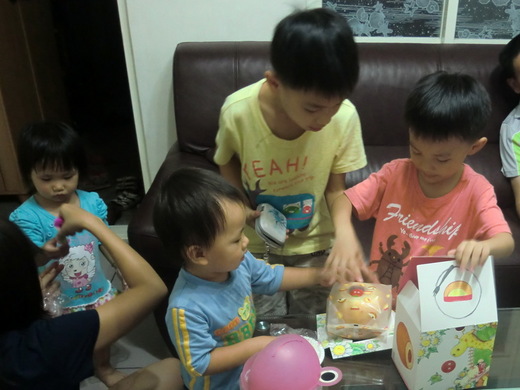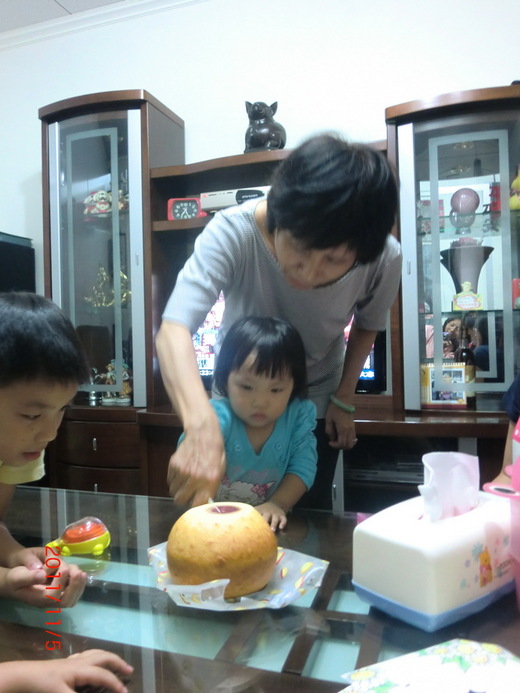年輪蛋糕分三層 , 中間是草莓果凍 , 接著是顆富士蘋果 , 外層則是年輪蛋糕 , 感覺很新奇 . 妞寶拿著蛋糕還開心的說"阿儒的生日快樂" , 點上蠟燭 , 一群人幫妞寶唱生日快樂歌 , 真是熱鬧 , 阿嬤牽著妞寶的手切蛋糕 , 蛋糕中間的部分太硬 , 拿出水果刀才切的下 , 小朋友們都喜歡吃中間的草莓醬 , 妞寶也不例外 , 吃完草莓和冰心蘋果後 , 剩下的年輪就留給媽媽吃了 , 真是孝順 .