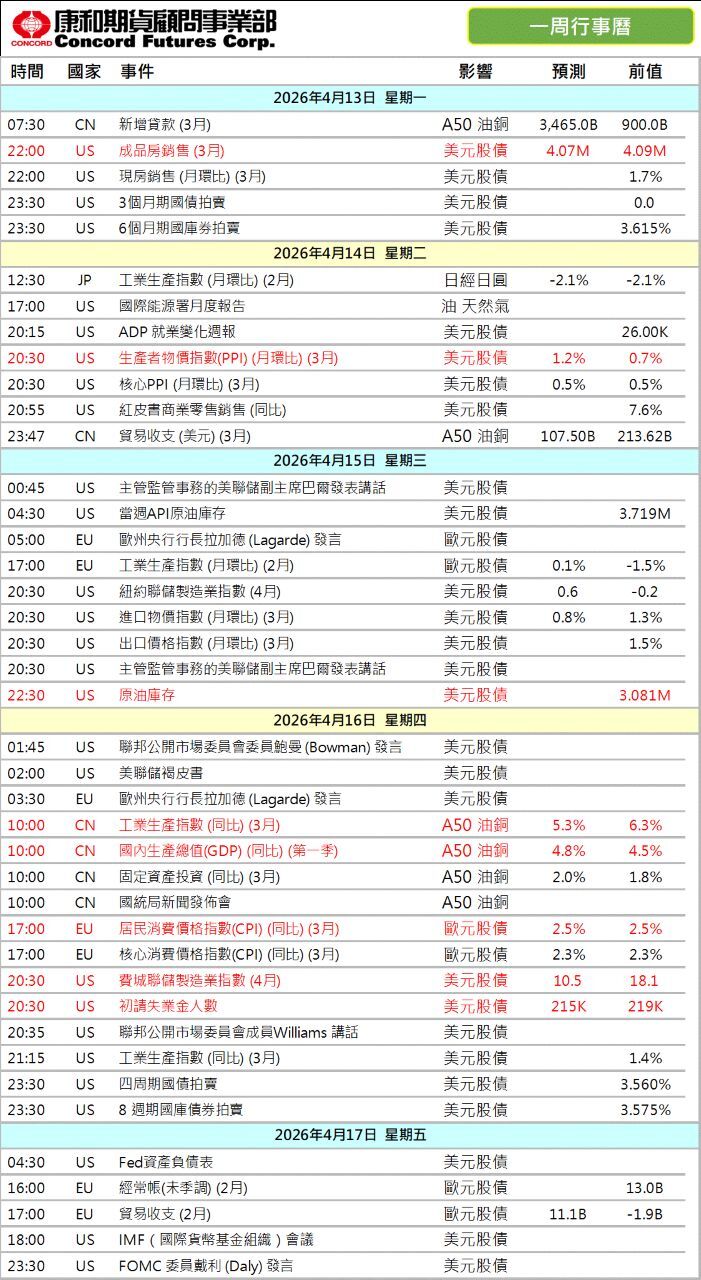 康和期貨-重要數據行事曆20260413-20260417