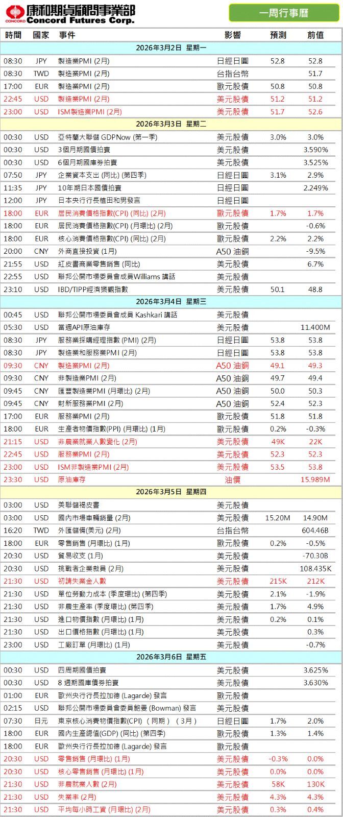 康和期貨-重要數據行事曆20260302-20260306 資料來源:https://www.concordfutures.com.tw/ConcordFutures/ (註:依現況資訊不定時更新資料...