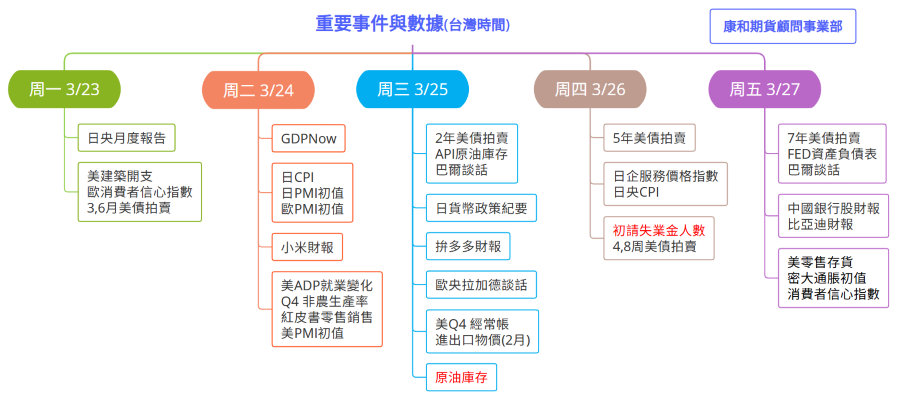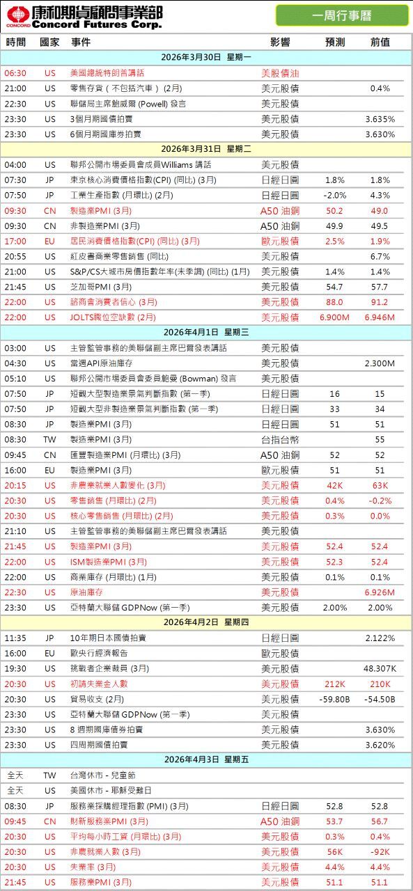 康和期貨-重要數據行事曆20260323-20260327 資料來源:https://www.concordfutures.com.tw/ConcordFutures/ (註:依現況資訊不定時更新...