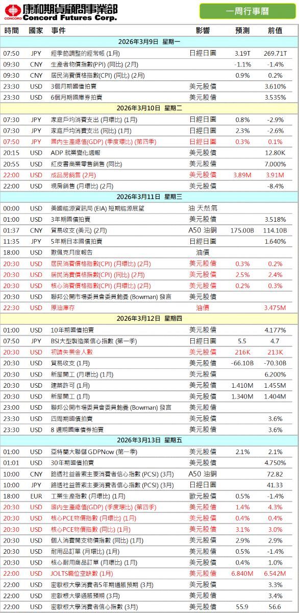 康和期貨-重要數據行事曆20260309-20260313 資料來源:https://www.concordfutures.com.tw/ConcordFutures/ (註:依現況資訊不定時更新資料...