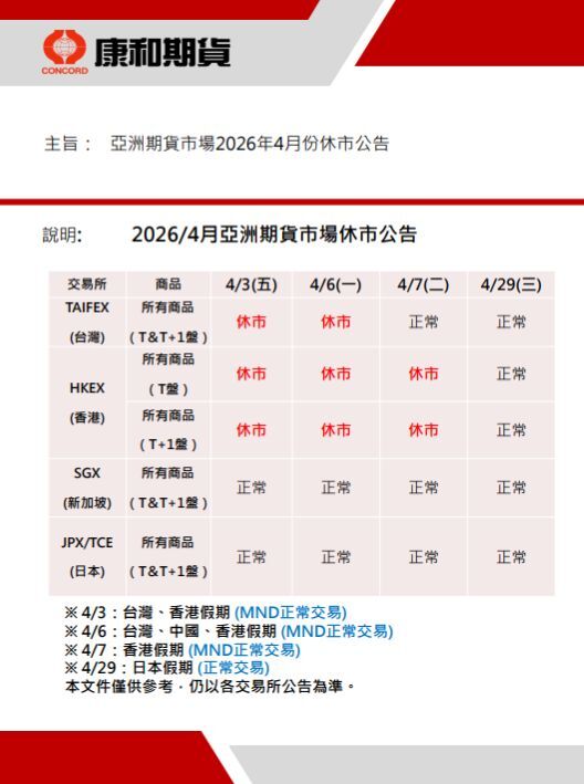 亞洲期貨市場2026年4月份休市公告 04/03(五):台灣、香港休市 04/06(一):台灣、香港休市 04/07(二):香港休市 資料來源:https://www.concordfutures.c...