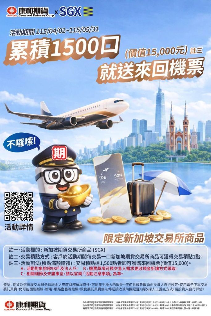 ❗❗不囉嗦❗❗ 📱凡活動期間交易新加坡交易所(SGX)海期商品📱 累計達 1,500 口!就送15,000元的旅遊禮券 🎊不限新舊戶、無基期、無門檻🎊 ✈ 想拿來換機票 🏝 或折抵國內外旅遊...