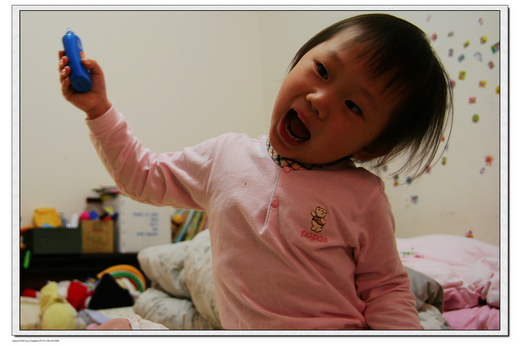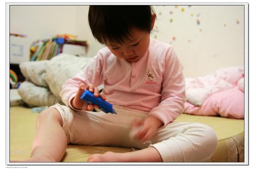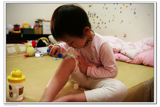 媽媽今天掛病號,請假休息,當媽媽正因藥效發做在昏昏欲睡時,小妮子竟拿防曬塗的到處都是,被她打敗了。