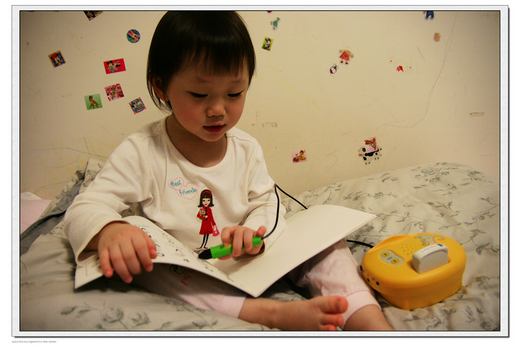 這個魔法筆是在小捷一歲多時買的,這些日子以來小捷斷斷續續的使用這套魔法筆,雖然使用之後,小捷的英文談不上突飛猛進,但小捷對於已經學過的英文歌、單字,好像刻印章一樣深深的印記在她的腦海裡。