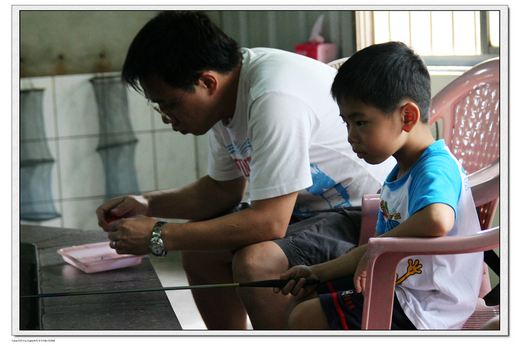 噗~一再中蝦的我們,和旁邊痴痴的等著蝦子上鈎而眼神呆滯的人們,我們真的顯的忙碌許多,單純的小孩不知社會險惡,一再中蝦就夠讓人眼紅了,小捷釣到蝦子後還大聲說『我是釣蝦高手』那些人聽到應該更嘔吧!