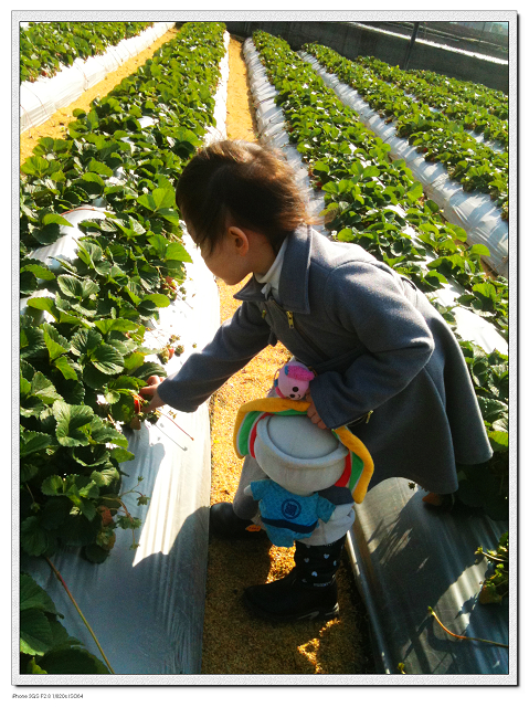 吃完午餐我們就出發去採草莓了,雖然外頭太陽很大,但風吹起來還是很冷,我們採了一會兒就趕緊進入屋內了!小捷的鼻子都凍的紅紅的~