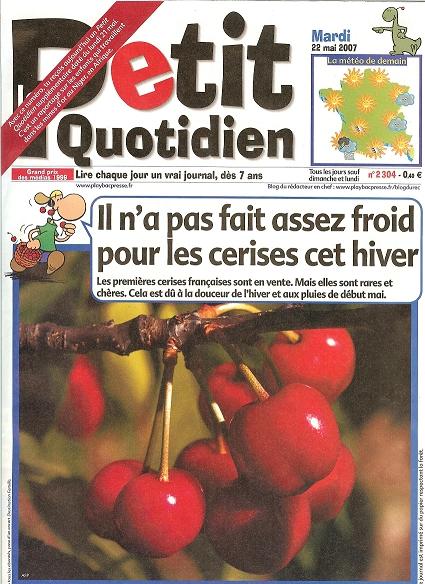 前兩天女兒的兒童日報以櫻桃為頭條新聞,說今年的櫻桃剛上市,又稀少又昂貴,原因是這個冬天不夠冷,櫻桃樹沒有經過該有的冰凍週期,無法製造出該有的產量來。加上五月以來經常大雨不斷,造成結了果的櫻桃都因水分過度充沛而爆裂,導致提前的腐敗與霉爛。