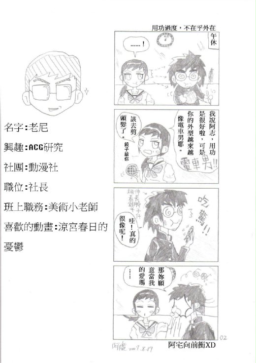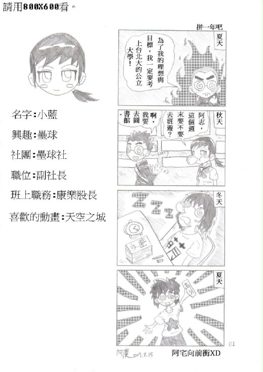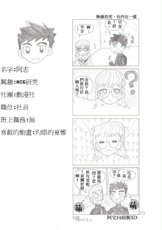 畫漫畫真的不容易呢,我一張原稿就要花掉一個小時以上呢!我的工具很簡單,就是鉛筆和擦布(沒錢買專用的工具,而且也不會用@@"),然後再用電腦修飾。第一回的故事主要是讓大家知道誰是主角;讓大家知道主角的個性與嗜好,故事背景設定在考完大學剩下的一個多月(畢業前)。本漫畫連載於每週六,每回三篇,請多多指教。故事內容純屬虛構,如有雷同純屬巧合。