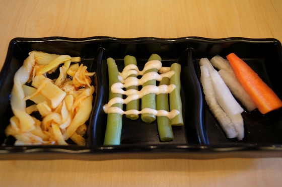 三種不同風味的開味小菜,辣、甜和酸都有。