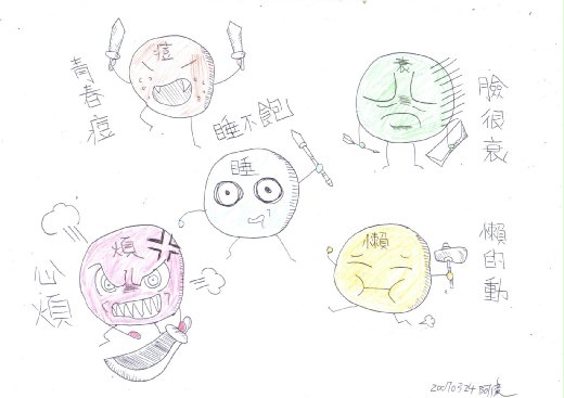 痘痘魔:因為壓力和睡眠不足,導致長痘子。