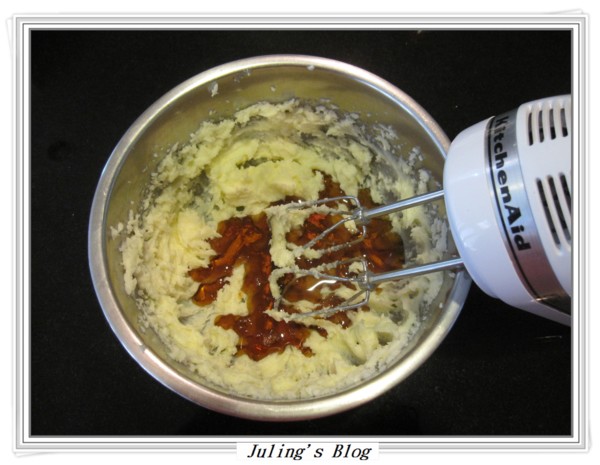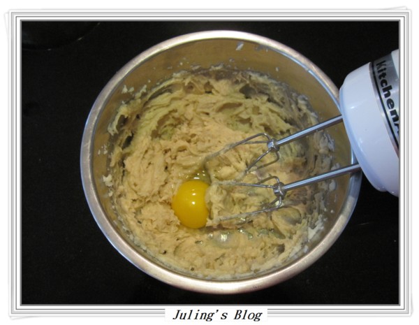 2. 分次加入蛋(每次加入需先混合均勻,才能再加蛋)拌至奶油糊鬆軟.