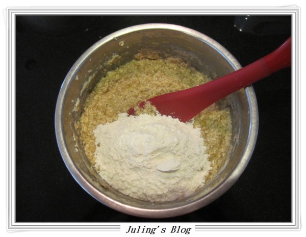 5. 再分次加入過篩的粉類(材料B)拌勻.