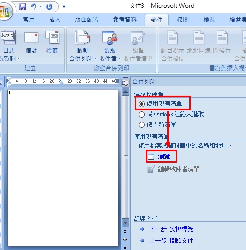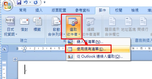 2. 「郵件->啟動合併列印->逐步合併列印精靈」 (對不熟的朋友, 可選擇此項, 幫忙引導)