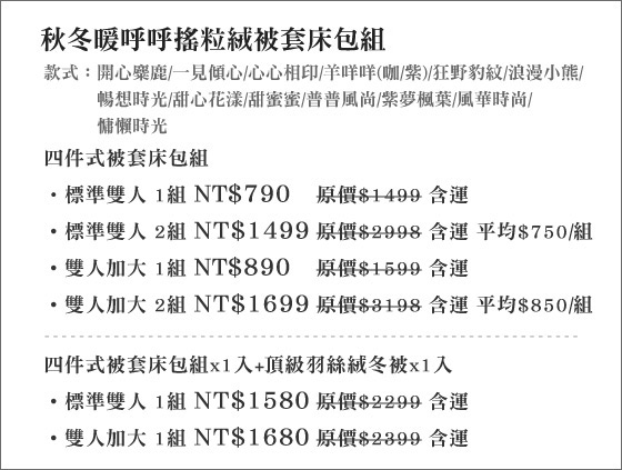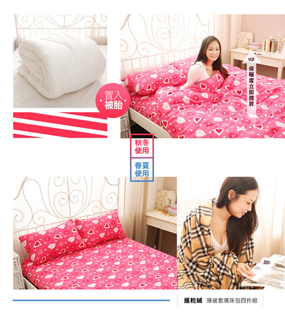 | 秋冬暖呼呼搖粒絨被套床包組-超保暖兩用床包組,可當作毛毯、加入被胎當被套,新一代搖粒絨材質不起球、不退色,冬日中的溫暖小確幸!只要790元起(含運)即可購得原價最高3198元秋冬暖呼呼搖粒絨被套床包組 售價:790 我要購買 |