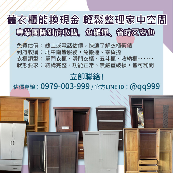 一通電話或一張照片,就能完成 線上估價、預約搬運、現金收購,讓您的舊衣櫃輕鬆找到新主人,居家空間煥然一新。