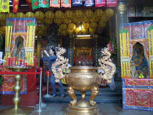 順序四:在○○○○○大香爐前跪下,舉香參拜,口唸或心唸「○○○○○,爐下弟子某某人,祈求○○○○○賜給弟子○○○○○,出入行車平安,朋友照顧,大家賺大錢,感謝!」, 跪姿舉香行三鞠躬禮,起立舉香,再行三鞠躬禮, 插三支香於關聖帝君後,往中間內殿 ○○○○○神案前移動。