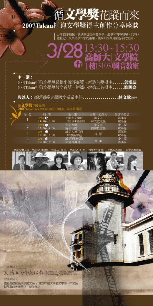 2007Takau打狗文學獎推廣活動 一、活動主題:循文學獎花蹤而來 2007Takau打狗文學獎得主創作分享座談 二、活動緣起: 打狗文學獎自2003年開辦,每兩年辦理一次。第三屆2007Takau打狗文學獎,本局遴聘國內的文學大家,評審出20位傑出的文學創作菁英。為提升本獎項在文壇的熱度與能量,塑造「Takau打狗文學獎」的品牌地位,擬規劃本屆得獎者進入校園及在地書店,與讀者及創作者分享其創作歷程及參賽經驗,藉此表彰他們對文學的辛勤投入及其創作的多樣且精彩的文學作品,並鼓勵有文學天分的寫作者加入創作的行列。 三、主辦單位:高雄市政府文化局 合辦單位:國立高雄師範大學國文系、國立中山大學中文系、誠品書店大遠百店、夢時代店 四、活動內容: (一)邀請本屆文學獎各類首獎得主以及評審走入校園及在地書店,與文學系所學生、市民、讀者,分享此次得獎作品、創作歷程,交流實際參賽與獲獎經驗,期以得獎者豐富的創作經歷,帶給參與的學生及讀者,對於文學的傳承與創作、堅持的歷程有更深刻的感受,也讓本屆文學獎得主在透過對談的過程中與文學系學子及讀者分享這份得來不易的榮耀。 (二)校園場次以「文學午茶」方式座談;書店場次以其「書區講座」方式進行,活動場地由合辦學校及在地書店提供,並配置有多媒體簡報系統與簡單音響系統。此外,製作活動背板,將活動主題、主講人、主講題目呈現於上,讓參與座談的學生及讀者能夠清楚了解活動內容,進一步宣傳打狗文學獎推廣目標。 五、活動場次 ★3月28日(五) 14:20-16:00 高雄師範大學文學院視聽室 主持 國文系林文欽主任 得獎者 郭漢辰 歐陽嘉 ★3月31日(一) 12:20-14:00 中山大學蔣公行館中文系 主持:簡錦松主任 得獎者:凌煙 歐陽嘉 ★4月5日(六) 15:00-16:00 誠品大遠百店 7F書區中庭 靜宜大學台文系楊翠教授 得獎者 郭漢辰 歐陽嘉 ★4月6日(日) 15:00-16:00 誠品夢時代店 3F書區舞台 主持:知名作家季季 得獎者:凌煙 郭漢辰 校園分享座談流程: 時 間 內 容 12:20~12:25 (14:20~14:25) 主持人引言 12:25~12:30 (14:25~14:30) 得獎者獲獎紀錄、得獎作品及出版品介紹 12:30~13:20 (14:30~15:20) 「循文學獎花蹤而來」開講:——2007Takau打狗文學獎得主創作分享座談~ 13:20~13:40 (14:20~15:40) 互動/問與答時間(贈送提問者每人作品輯乙套) 13:40~14:00 (15:40~16:00) 主持人結尾、贈書、簽書 書店分享座談流程: 時 間 內 容 15:00~15:05 主持人引言 15:05~15:10 得獎者獲獎紀錄、得獎作品及出版品介紹 15:10~15:40 「循文學獎花蹤而來」開講:——2007Takau打狗文學獎得主創作分享座談~ 15:40~15:55 互動/問與答時間(贈送提問者每人作品輯乙套) 15:55~16:00 主持人結尾、贈書、簽書 |