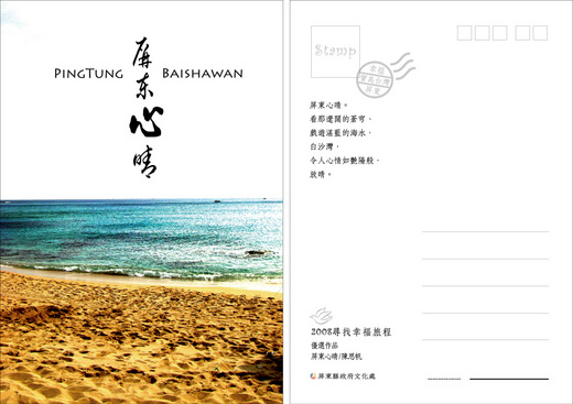 屏東縣首次舉辦的「2008尋找幸福旅程-旅遊文學館明信片徵選活動」,在全國民眾的熱情參與下,共有230件作品參賽,由於參賽作品水準極高,激爭相當激烈,經嚴謹的初審、複審後,順利選出不分名次的10件優選、10件入選作品,其中主辦單位委託專家,將獲得優選的十件作品,進行整體規畫,印刷成10件為一套的屏東旅遊明信片,做為推廣、行銷屏東旅遊心情之用。