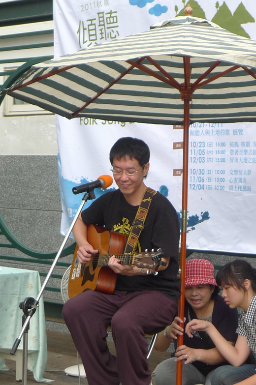 10月23日下午,客家歌手林生祥,來到屏東旅遊文學館旁的廣場彈唱客家歌謠。他不但要面對隔鄰大樓正興建的吵雜聲,還有來自不遠處的運動場傳來一波波凍蒜聲。