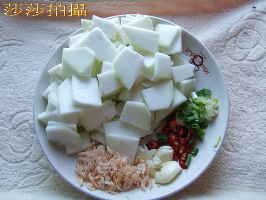 起油鍋先放入蝦皮爆香在放入蒜頭略炒出香味~放入葫蘆瓜快炒~