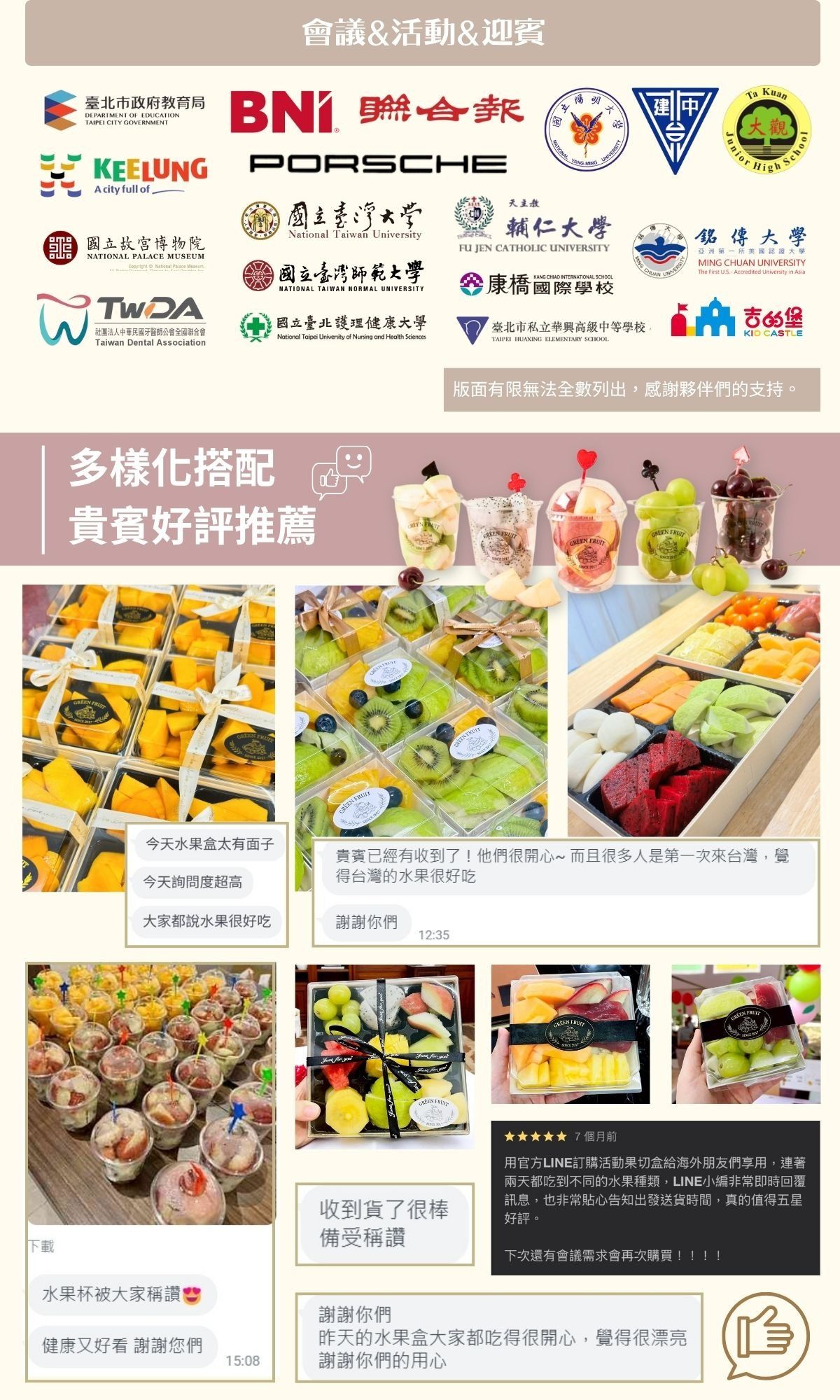 不論是公司會議還是協會活動,綠之果物皆提供客製化服務:您可以選擇水果內容、加上祝賀小卡,甚至印上企業LOGO,讓一份餐盒更有儀式感,成為企業形象的一部分。