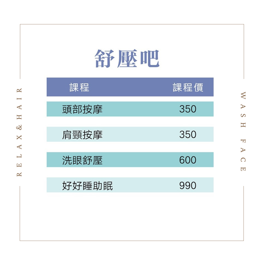 舒壓吧:以頭部、肩項、眼晴按摩為主,最推廌好好睡舒壓$990