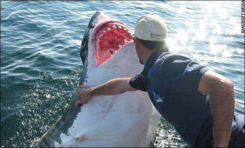 △補充資料:如果發現大白鯊,絕對不要想慌張逃走或不理牠,你必須隨時注意牠,如果要對付大白鯊,你只需要一根長鐵棍就可以了,以防牠太靠近你,記得,鐵棍不是打牠而是『戳ㄔㄨㄛ牠』,大白鯊只要一被戳到,就會知道你是有攻擊性的獵物而退去,盡量不要用拳頭打牠或用刀刺牠,不要用拳頭的原因,因為牠皮膚過於粗糙,容易割傷拳頭,而用刀刺牠,牠很容易在血中抓狂,就算真的退去,流出來的血會引來更多鯊魚,最後更多麻煩,就算手無寸鐵或被牠咬住,別讓牠咬住手,這樣才能攻擊牠的眼睛和鰓,這兩都是鯊魚的弱點,可以讓鯊魚早點放開你,逃命時請盡快游到岸上,但也請注意鯊魚,如果被鯊魚圍繞時一定要注意著牠,甚至你自動慢慢朝向鯊魚前進,就連大白鯊都可能會害怕的想逃走,但請記住,『不可以冷靜保持不動』,不然一定會引起鯊魚攻擊。