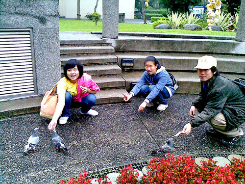 那時我們的教會在整修,所以我才有機會到這來看鴿子 ,俗話說鴿子代表和平。於是,我們在一塊撿地上的麵包餵鴿子,剛開始兩個女生都不曉得如何跟鴿子互動。但,我知道,鴿子會害羞但只要維持不動,相信鴿子一不會把我們當敵人,果然,在我和貞羽慢慢的指導惠瑜之後,鴿子就像好奇寶寶一樣,像我們前進。