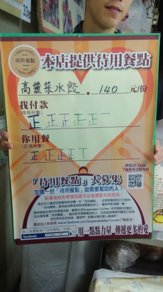 這是屬於一種自發性的慈善活動,響應全球Suspended Coffee(待用咖啡)的概念,讓我們台灣愛心滿滿。