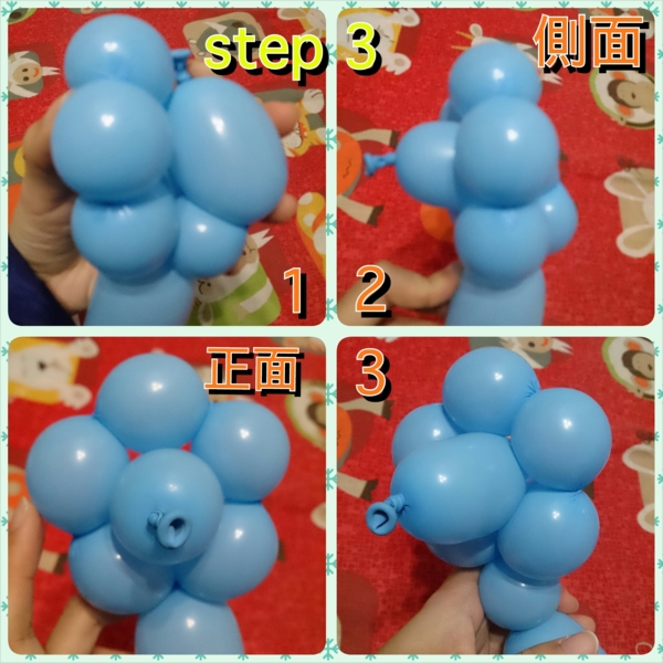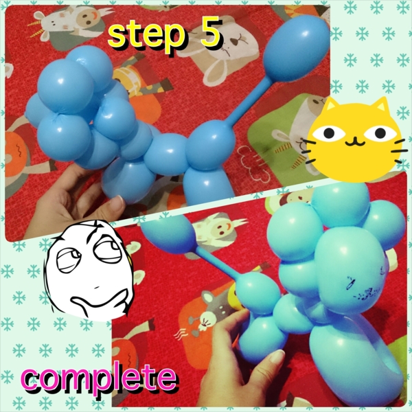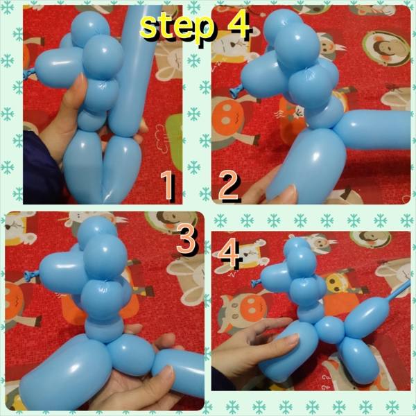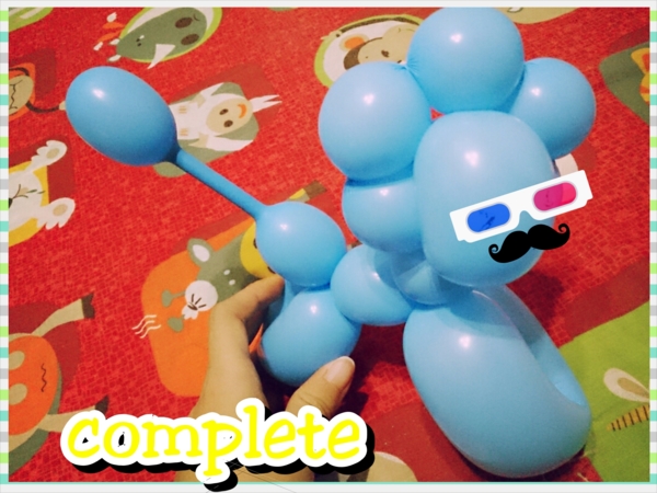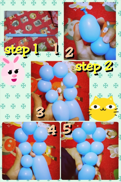 步驟5:之後將一點點氣擠到後面氣當尾巴,再來可以將第一顆球(臉的部分)抓住打結的地方繞到脖子那裏(把臉變的圓圓的,看不見打結的部分),最後加上眼睛嘴巴就完成囉!!
