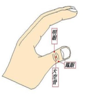 在我們的姆指上有三個相鄰接的穴道分別是明眼、鳳眼、大空骨(如上圖),明眼、鳳眼能夠改善眼睛疲勞和急性結膜炎,大空骨則可改善一切有關於眼睛的症狀。