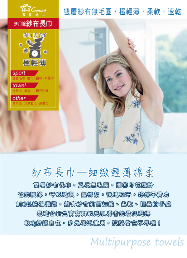 沐浴洗滌後,體驗看看Gemini 雙星毛巾的紗布長巾。