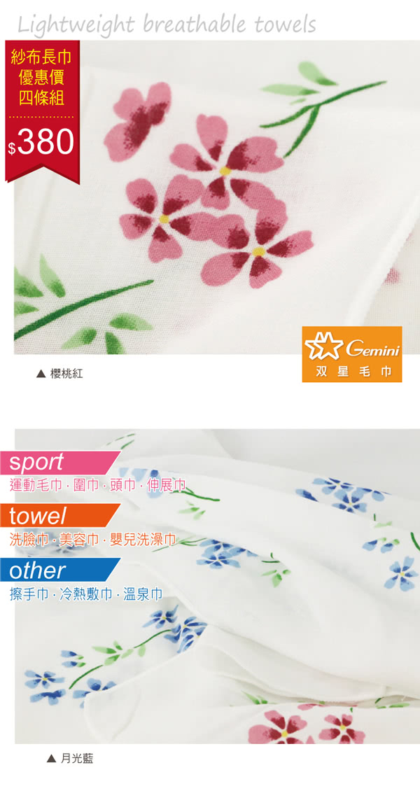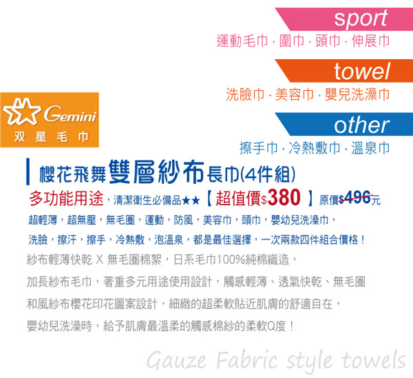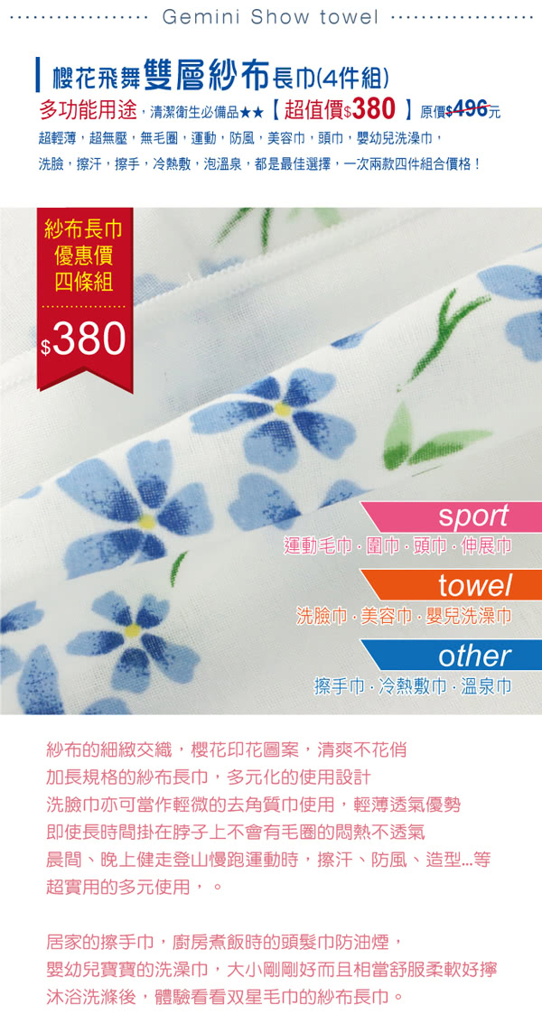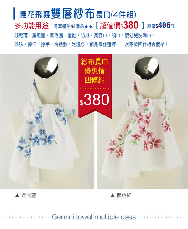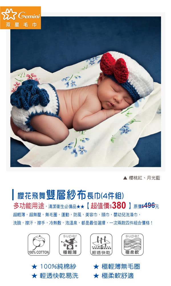 雙11特惠活動,搶到賺到:【Gemini 雙星】櫻花飛舞雙層紗布長巾4件組(多用途紗布長巾細緻輕薄棉柔)