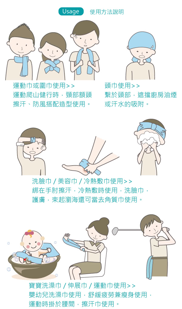 ※洗臉巾、美容巾、冷熱敷巾使用:綁在手肘擦汗,冷熱敷時使用,洗臉巾,護膚,束起瀏海還可當去角質巾使用。