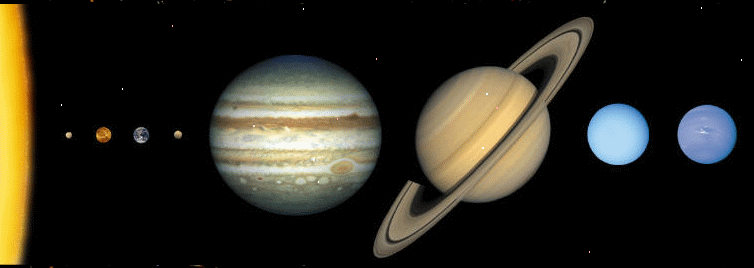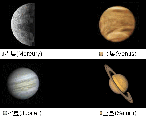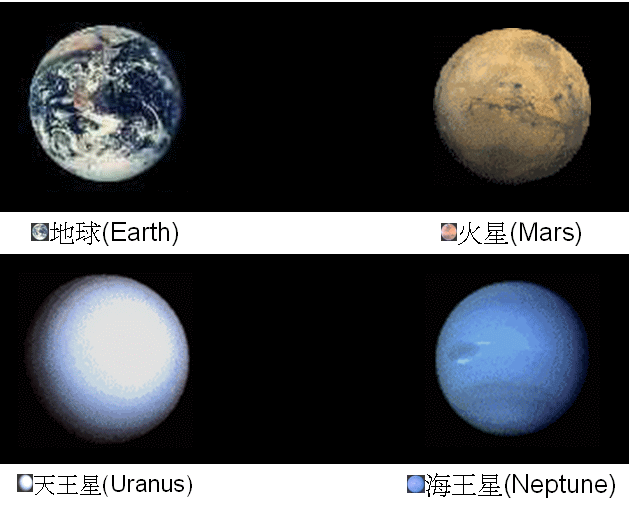 圖3是太陽系的八大行星的合照, 依照距離太陽遠近排列為: 水星, 金星, 地球, 火星, 木星, 土星, 天王星, 海王星.