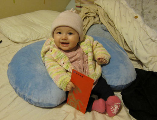 媽媽說她也準備了一個紅包給小縵,這大概是唯一一年小縵可以直接收到阿嬤紅包的一年。阿嬤在餐廳時提到說除夕夜要把紅包袋放在枕頭下,象徵以後會變富貴喔,我記的小時候我爹娘就這樣跟我們說的,隔天紅包裡面的錢會變多,我想我阿娘應該是自己當聖誕老人多放些錢進去,讓我們相信這個傳統的吧。太久沒有收過紅包了,都已經忘記這些傳說中的傳統了。翻譯給s聽後,他說 "那小縵應該會半夜起來算錢,要是有變多就安心去睡覺,要是沒有變多,就開始玩樂,不用聽話了,這是哪門子的邏輯啊,我和阿娘笑到不行,對於我們的傳統,我總是就這樣相信了,對於S來說,他的想法就有點天馬行空了一些,到也提供我們很多想像,尤其是小縵正在學坐,半躺著的時候,她總是想要做起來,一邊用力,一邊ㄥㄥ叫的,所以,當S這樣講小縵的時候,我們真的很有畫面的呢。