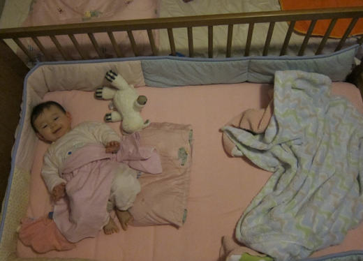下圖:小縵感冒前,戒奶嘴之後的連續三天的11.5小時的睡過夜,這張照片是其中有一天醒來,我在那個角落找到小縵,真會滾啊。還有一天,醒過來的時候,剛好把屁股擺在枕頭上,挺好笑的。