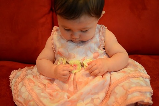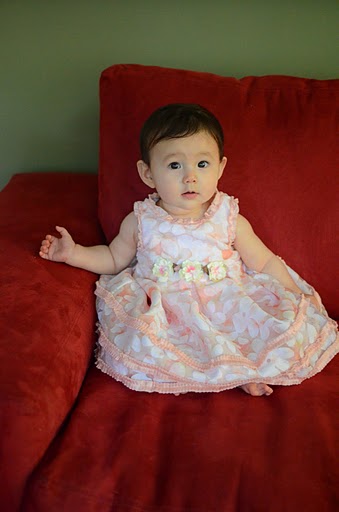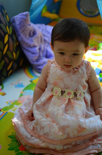 6/3/11 星期五晚上,和幾個朋友一起去吃飯,當然,小縵也去了,表現的真好,吃吃小點心,喝喝水,說說話,甜甜的對朋友們笑,我們整晚都不用抱小孩,自然有人黏著小縵玩小孩。隔天早上, S 好心的讓我小睡一下,他來照顧小縵,真好。晚上, S 拿了相機的記憶卡說是讓我讀取照片,我看了那些照片,哀嚎的說 “ 哎呦,你的相機的日期又錯了啦,怎麼會是今天呢,這都錯亂了 ” ,結果搞了很久我才發現,那些照片是我在小睡的時候, S 幫小縵拍的,還這別在這裡用了一個段落來形容,那當然是特別的一件事啊,因為, S 趁我在小睡的時候,把那珍藏了一整年的小洋裝,那件小縵還在我肚子裡五個月大時候他堅持要買下來的小禮服,穿在小縵身上、拍照、再換回原來的衣服,真是個大驚喜啊。 S 得意的很呢。 ( 最下方的照片就是 ) 。