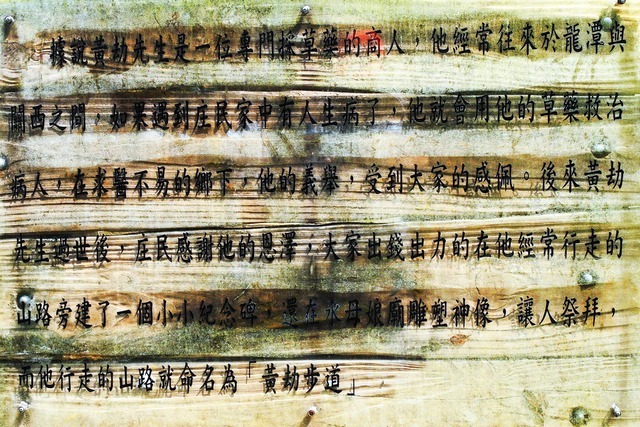 黃劫步道相傳是古代一位青草藥師,經常在關西和龍潭之間採藥,並且救活無數病人。鄉民為了感念他,便把這個小徑命名為黃劫步道。它位於水母娘道路旁邊的小徑,水母娘道路位於台三線旁仙草博物館旁的巷子,可以通往龍潭渴望園區和六福村。