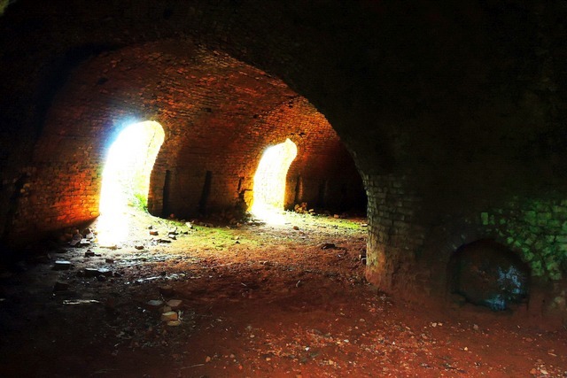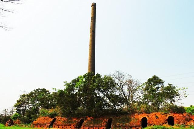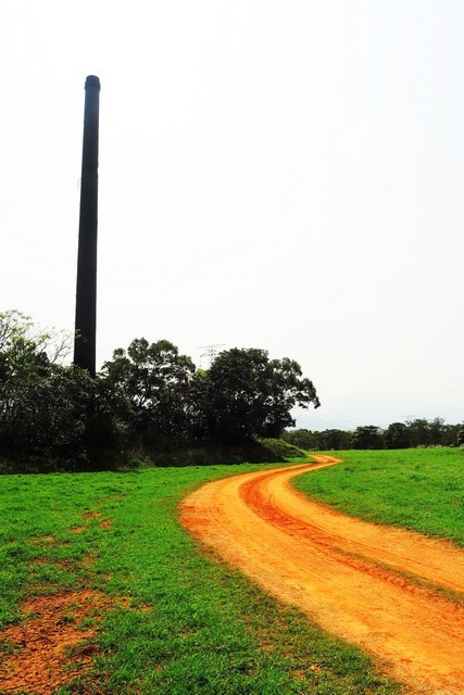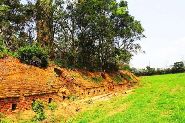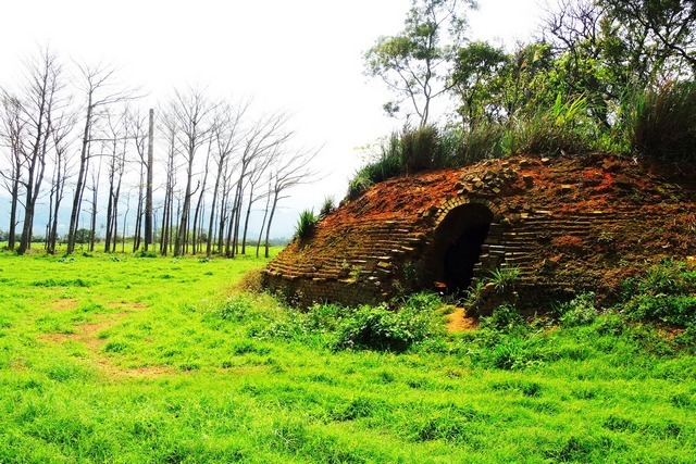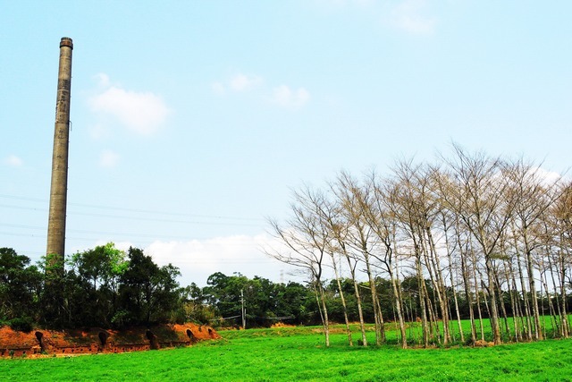 過了哪吒廟再繼續向前,可以轉到水母娘道路;沒兩步,便看到了兩根大煙囪。這裡是早已廢棄的磚窯,八卦形狀的「八卦窯」像是一個外星人基地。在一覽無遺的台地上,豎立孤立的大煙囪,旁有一片枯樹林,有點像是來到了西伯利亞勞改營的感覺。草地平坦,草長到腳踝,偶有枯黃牧草,看似田埂,橫著排列,微風徐來,踩在草皮上面彷彿踏浪前行。
