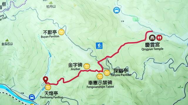 步道旁有一座名叫「天煌亭」的涼亭供休息,進入步道一開始是一連串的45度陡坡,而這種陡峭的坡道幾乎一直延伸到探幽亭,沿途都鋪設了石階、水泥階梯與水泥小路,苔蘚類和蕨類植物佈滿了山徑的兩側。