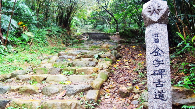 我們把車子停在淡蘭橋附近的空地,古道入口就在淡蘭橋旁,過橋後就看到「淡蘭山徑 金字碑古道」的導覽圖,而且中英對照,看起來這條古道名揚海外,外國遊客也會到此一遊,就像早上走三貂嶺步道時,途中就遇到六名外國遊客。
